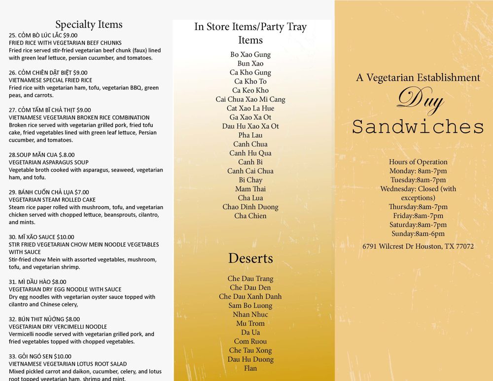 Welcome to Duy Sandwiches, a delightful destination for Vietnamese cuisine located in Houston, TX. This cozy eatery specializes in an array of fresh sandwiches and noodle soups, with standout offerings like their famous banh mi and a variety of vegan and vegetarian options. Whether you're craving the fragrant lemongrass tofu or a classic medium-spiced meat dish, each bite is a testament to the authentic Vietnamese flavor.